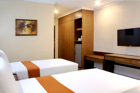 This spacious room offers two single beds, a dedicated dining area, and a bathtub, and is located on our higher floors for added comfort and privacy.